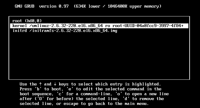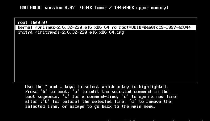step_3:进入如下界面后,使用键盘上的上下键,选中第二项以kernel开头的项。选中后,再次按e键。