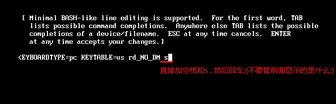 step_4:进入以下界面后,在最后面输入空格和s,然后回车。(注意:有的系统显示的内容可能和我下面出现的这一行不一样,没关系,直接加空格和s就行,不影响的;也就说什么呢,只要进入到这个页面,直接加空格和s,不要管他显示的是什么;)
